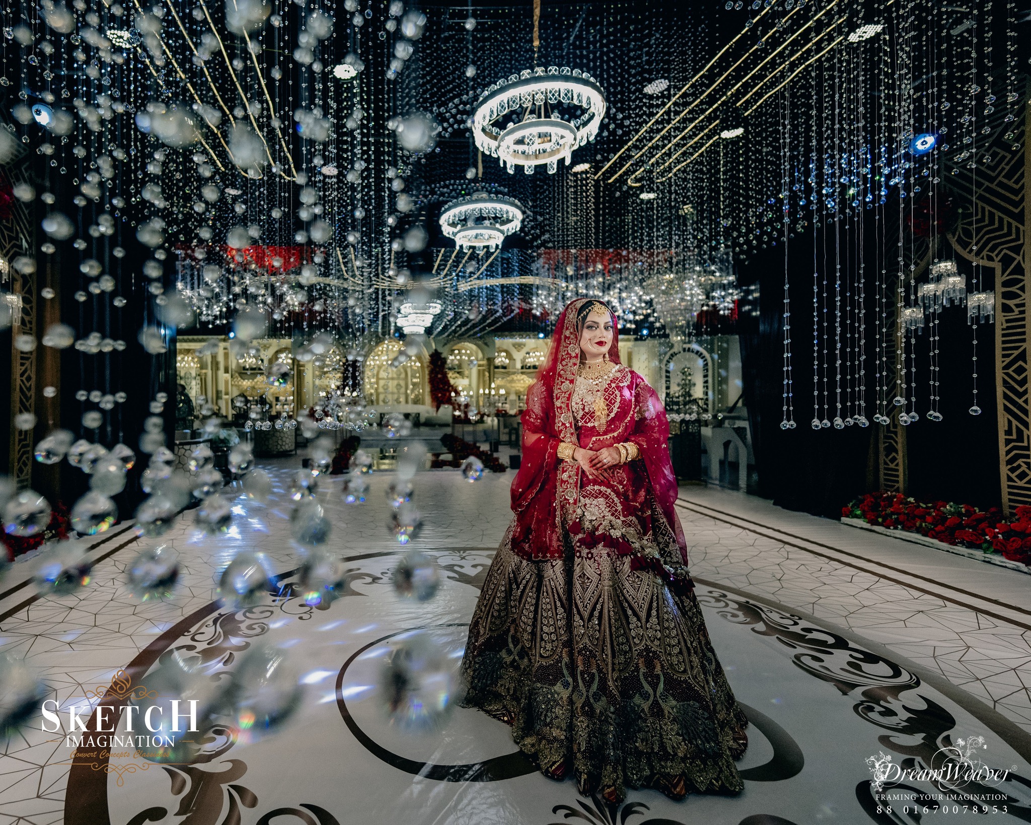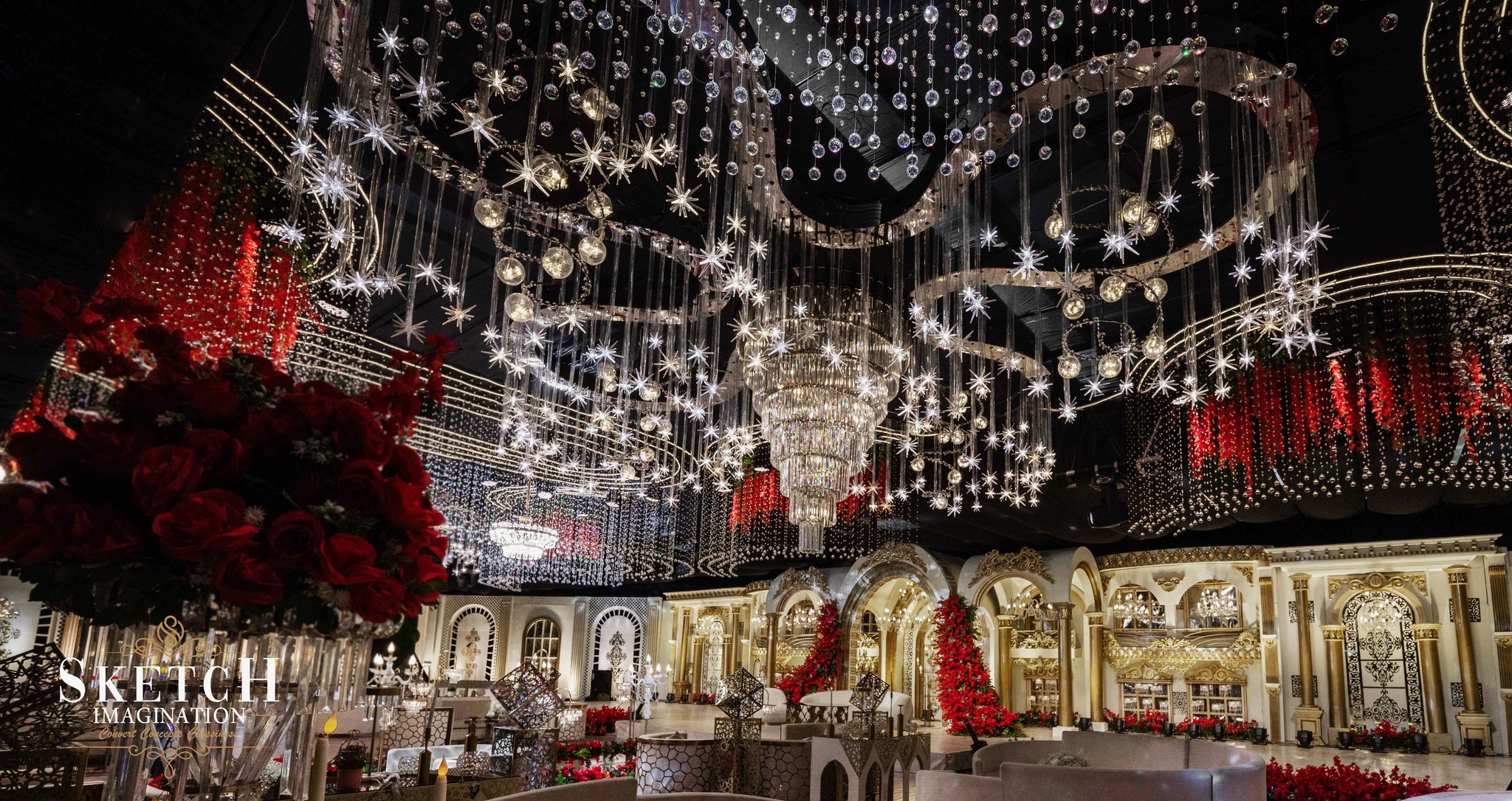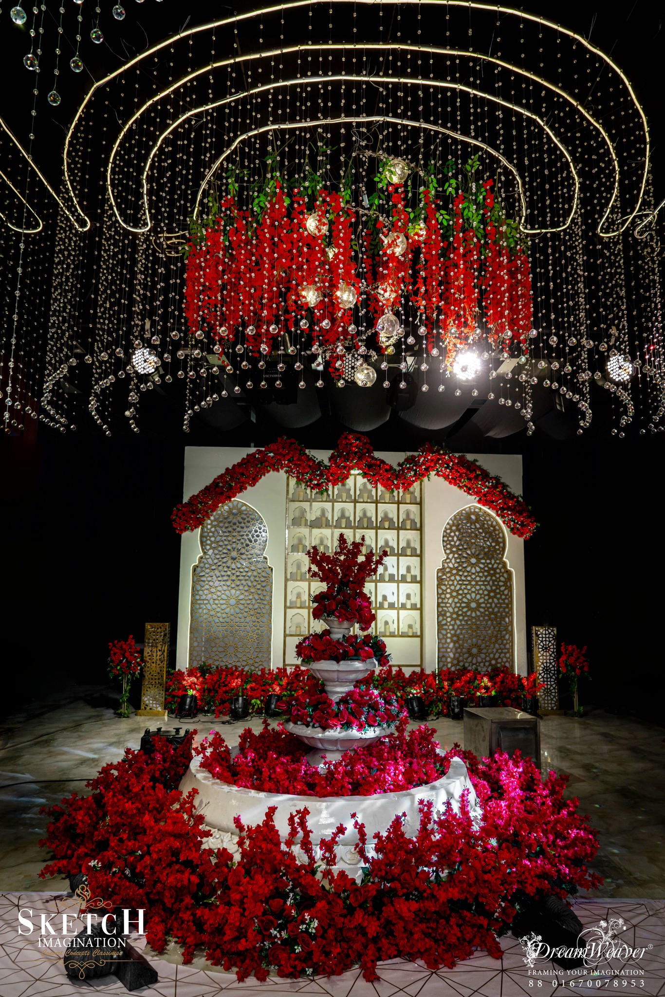 Wedding Ceremony of Arisha & Afzal. Every corner is graced with ornamental decor, adapted from the classic inspiration. Monumental arches stood proudly at the central stage, while an abundance of crystal hangings embraced the place to create an illusion of a timeless arch-tunnel.The artistry and grandeur transformed the space into an unforgettable magnificence.