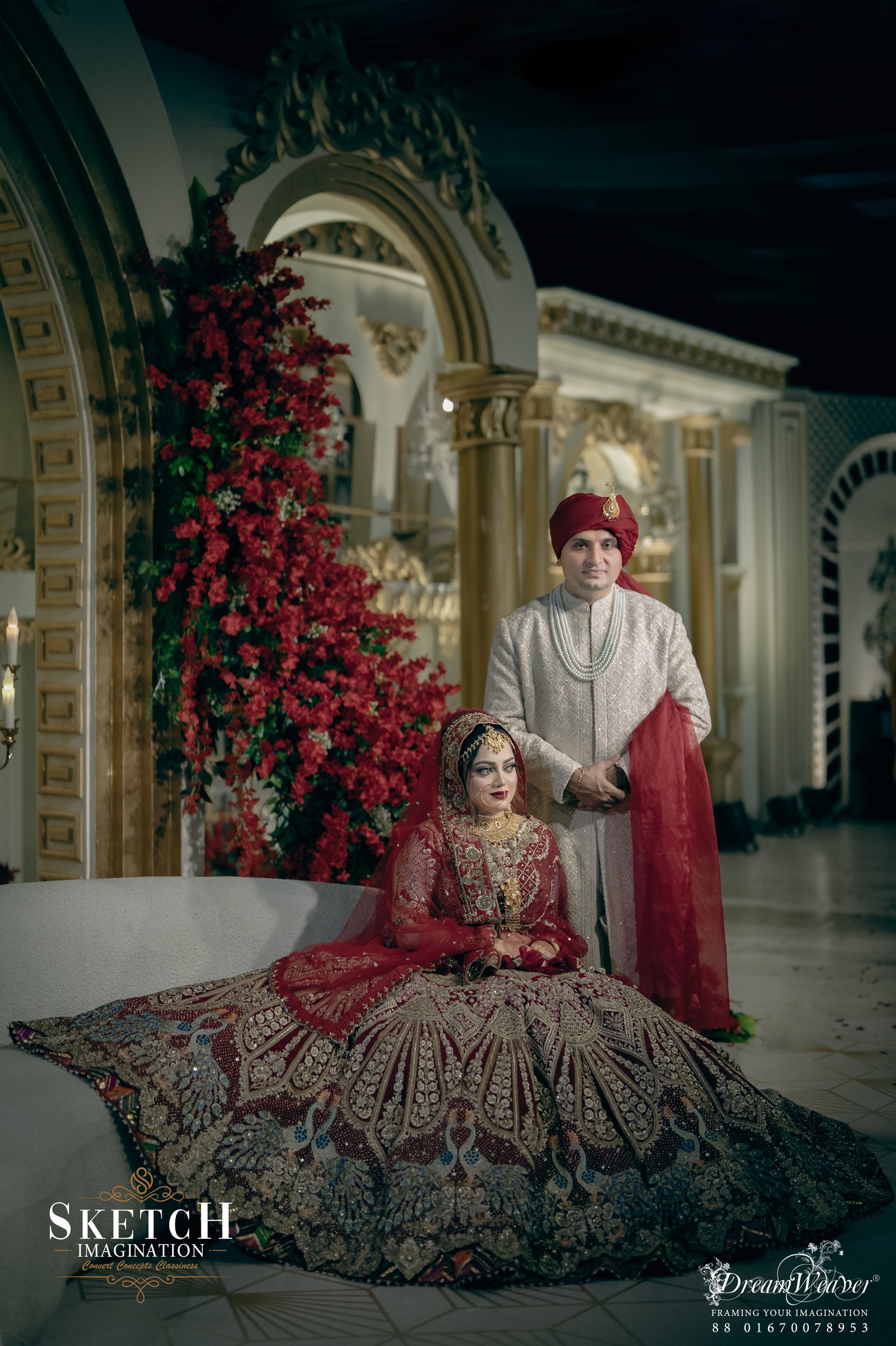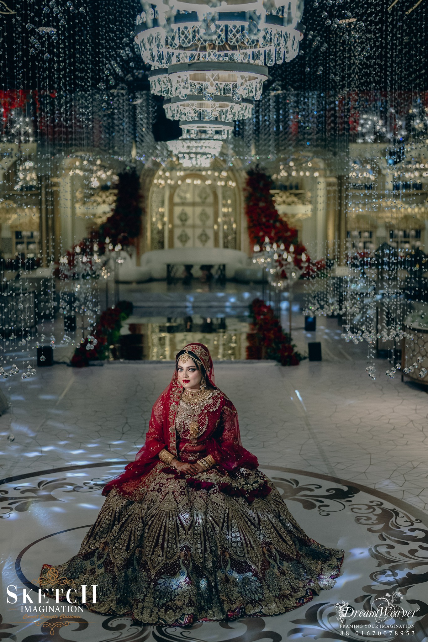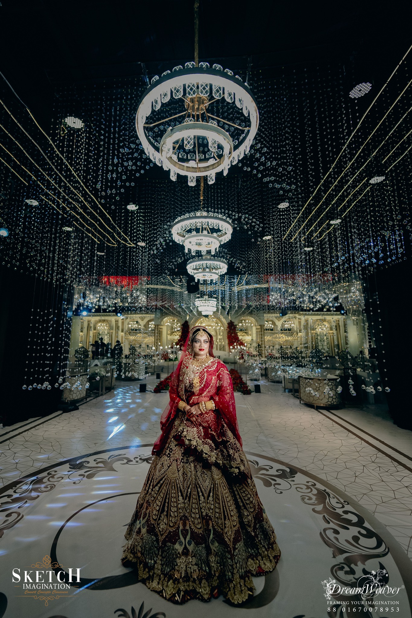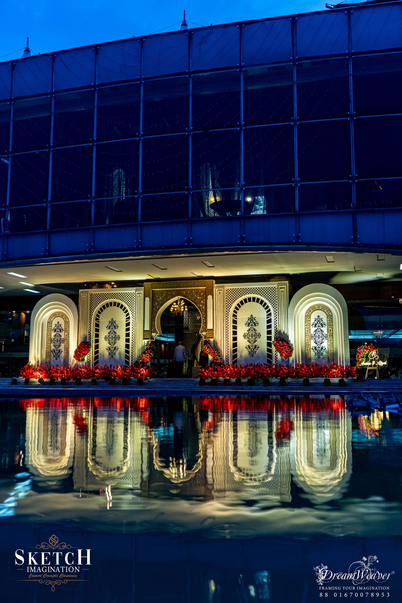 Wedding Ceremony of Arisha & Afzal. Every corner is graced with ornamental decor, adapted from the classic inspiration. Monumental arches stood proudly at the central stage, while an abundance of crystal hangings embraced the place to create an illusion of a timeless arch-tunnel.The artistry and grandeur transformed the space into an unforgettable magnificence.