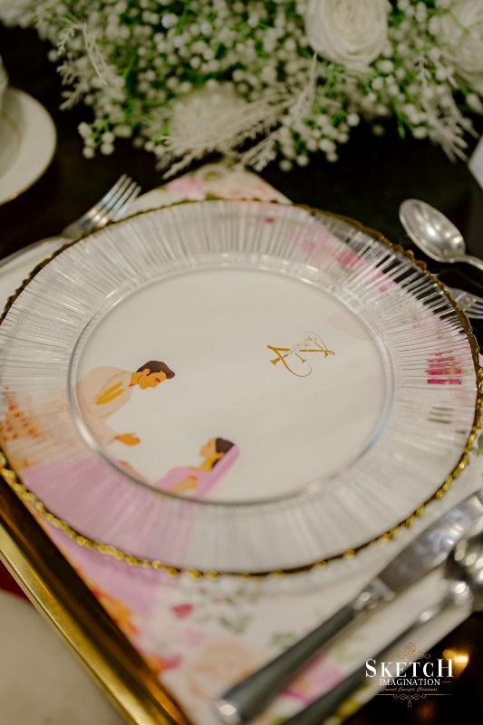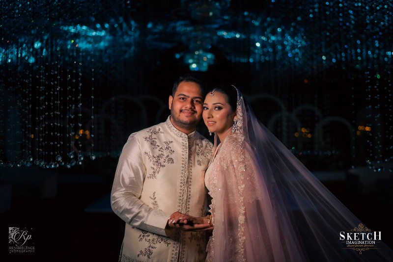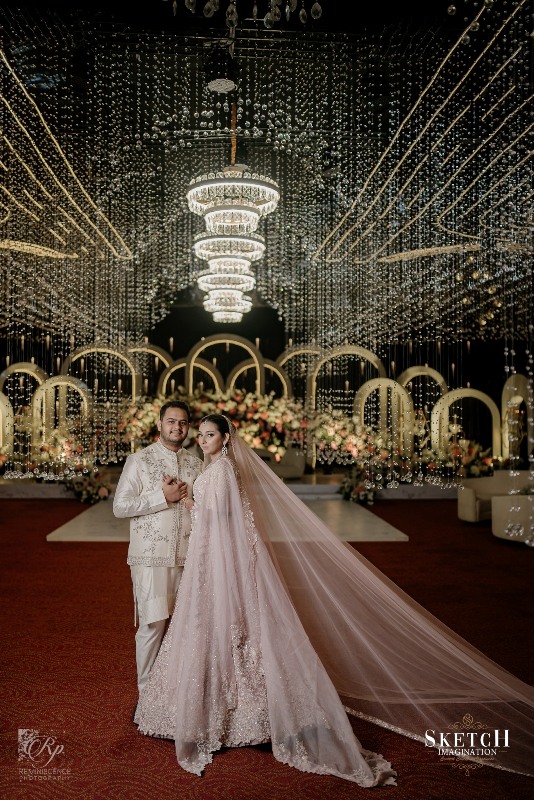 Nikah Ceremony of “Zidan and Farhana”. An elongated archway seamlessly formed of infinite crystal pendants to feel like walking under lustrous rain-drops. Finery blended with the blush palette wall art of abstract nature reflecting the spring, arranged in a sophisticated manner with the arcadia white toned ephemeral structures. Lush pastel florals gracefully adorning the cosy illuminated space giving the impression that less is more. Art deco style rows of monumental arches, played with the light and shadow creating an elegantly opulent ambience.