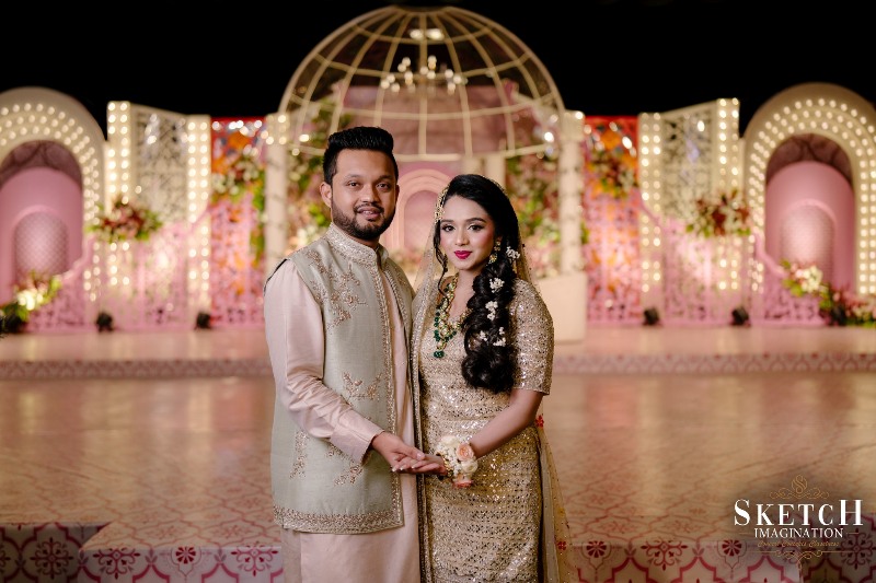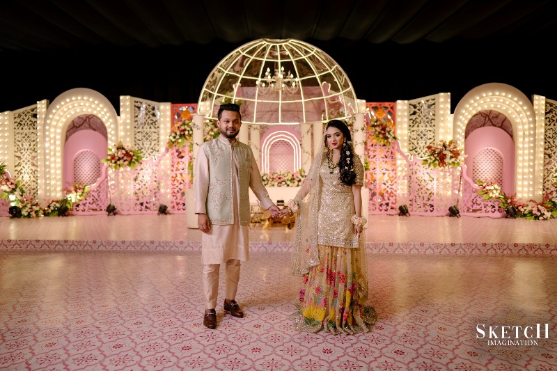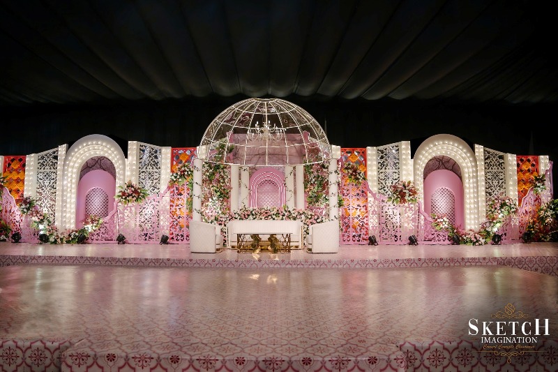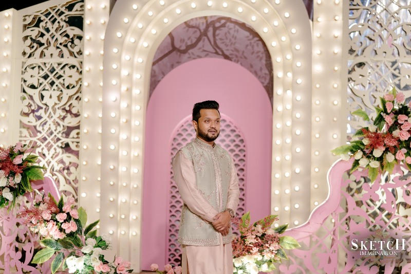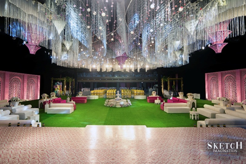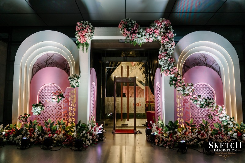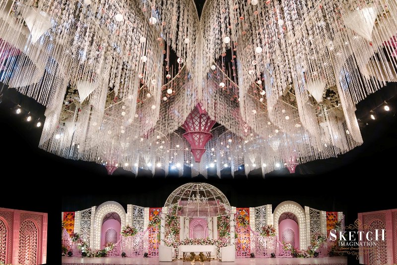 Inspired by the beauty of Esperance Rose, we applied a tint of pastel pink and pristine white in the whole splendor, from layered arches to the ornate Moorish carvings and the glass dome accented with pastel roses and purple hyacinths. Suspended pink floral garlands, crystal beads along with arrays of white yarns formed an installation that appeared like an intersection of multiple waves creating a mesmerizing view. At Sketch we create sweet and strong bonds with our clients to make it last for eternity.