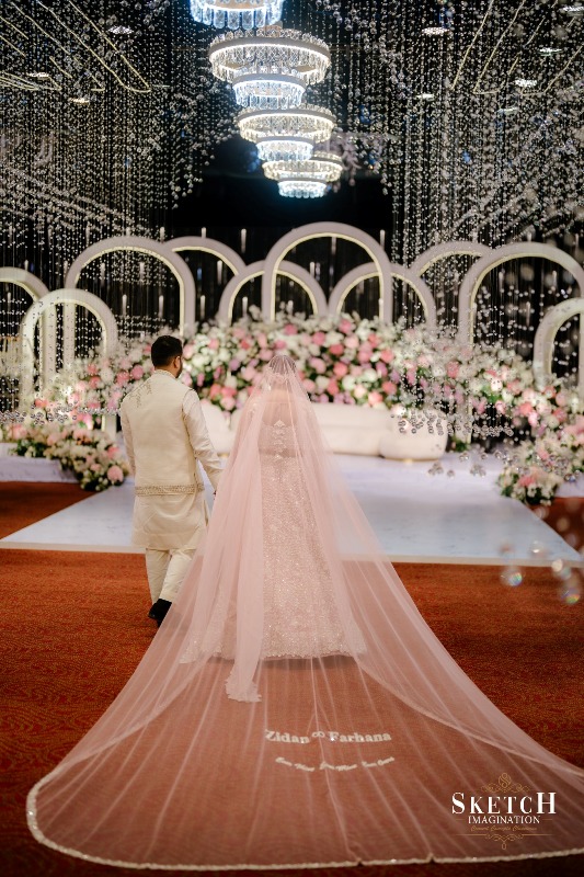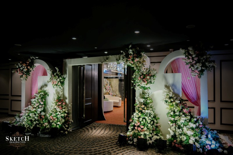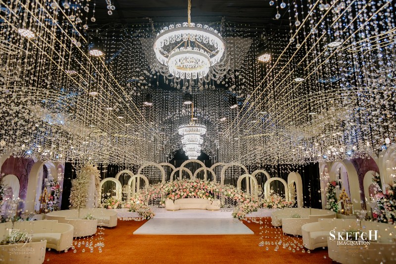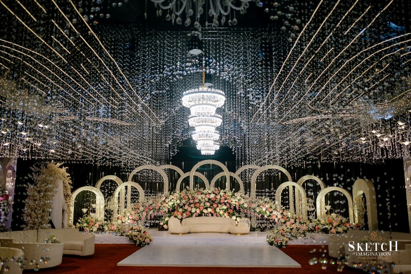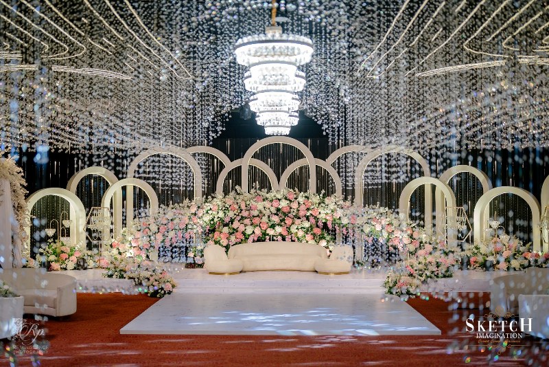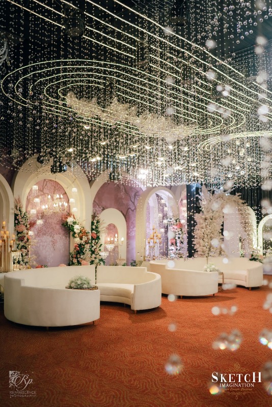 An elongated archway seamlessly formed of infinite crystal pendants to feel like walking under lustrous rain-drops. Finery blended with the blush palette wall art of abstract nature reflecting the spring, arranged in a sophisticated manner with the arcadia white toned ephemeral structures. Lush pastel florals gracefully adorning the cosy illuminated space giving the impression that less is more. Art deco style rows of monumental arches, played with the light and shadow creating an elegantly opulent ambience.