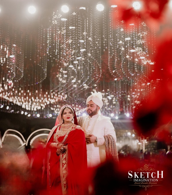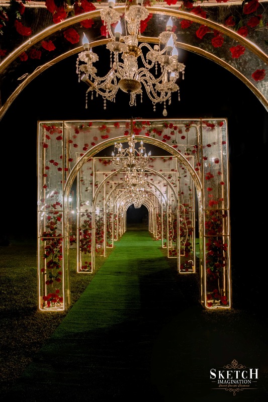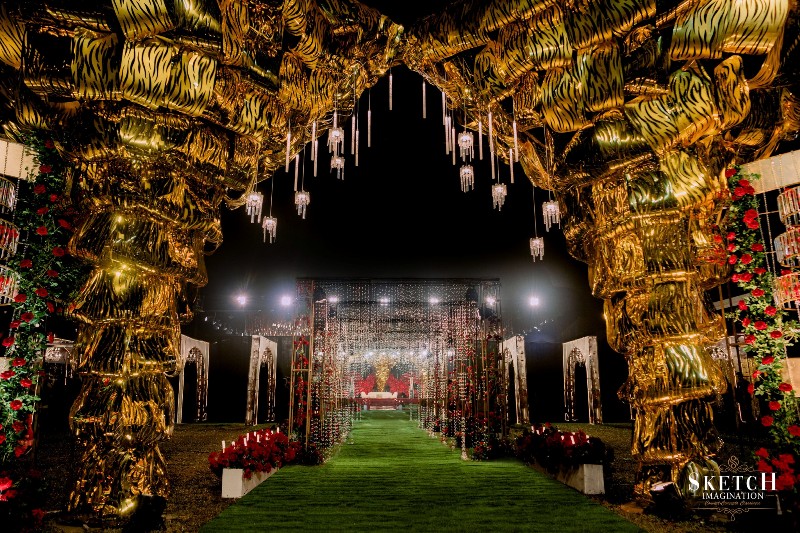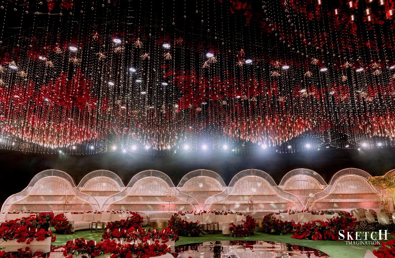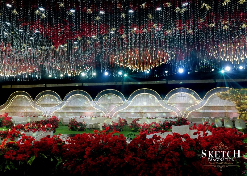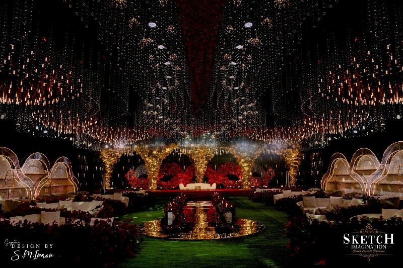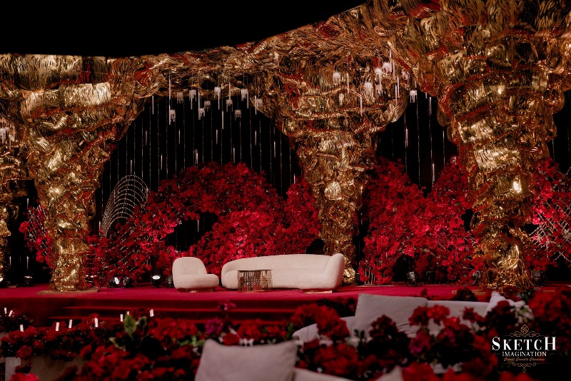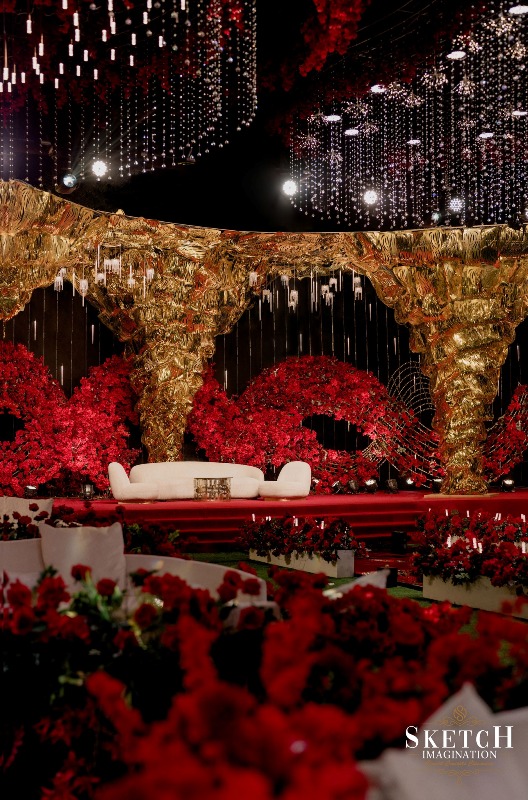 Inspired by abstract arboreal architecture and topographic patterns, the space was impeccably styled to evoke wonder. A shimmering golden setting — reminiscent of a gilded arbor nestled within a forest of red blossoms, all beneath a starlit ceiling — felt like stepping into a magical realm. Every detail whispered elegance, every corner radiated romance — an enchanting world, beautifully brought to life.